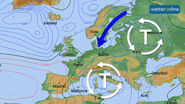 Ende der Woche gelangt zwischen einem Tief über Nordeuropa und einem Hoch über Südosteuropa milde Atlantikluft zu uns.