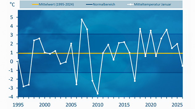 Das deutschlandweite Januarmittel liegt aktuell bei rund minus 0,5 Grad, also deutlich geringer als in den Vorjahren.
