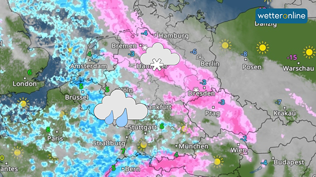 Im Übergangsbereich zur Frostluft in der Osthälfte Deutschlands ist auch vereinzelt gefrierender Regen möglich.