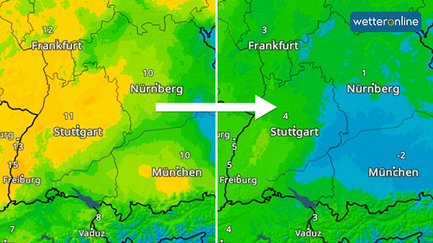 So zeigte das Thermometer in München am Freitag noch 10 Grad an, heute herrscht dort leichter Dauerfrost. In Freiburg wurde ein Spitzenwert von 15 Grad gemessen, heute werden maximal noch etwa 5 Grad erreicht. Morgen wird es am Oberrhein und Neckar sogar noch einen Tick kälter.