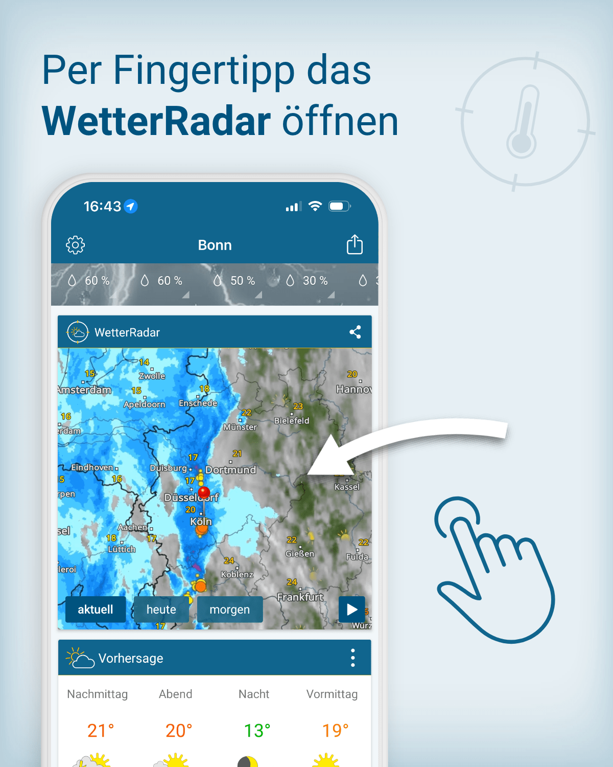 Wie du ganz einfach vom WetterRadar ins TemperaturRadar der WetterOnline App wechselst und was du darauf erkennen kannst, zeigt unsere Fotostrecke: