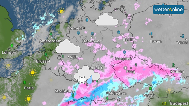 Der Sonntag zeigt sich tagsüber verbreitet meist trocken. Sogar die Sonne scheint hin und wieder mal. Erst nachmittags zieht von Westen her etwas Schnee, Schneeregen oder Regen auf.