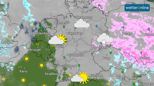In den übrigen Landesteilen bleibt es dagegen trüb, aber trocken. Nur in Richtung Oder und Neiße rieseln ab und zu ein paar Flocken vom Himmel. Die Höchstwerte liegen zwischen 0 Grad in Berlin und 11 Grad in Duisburg.